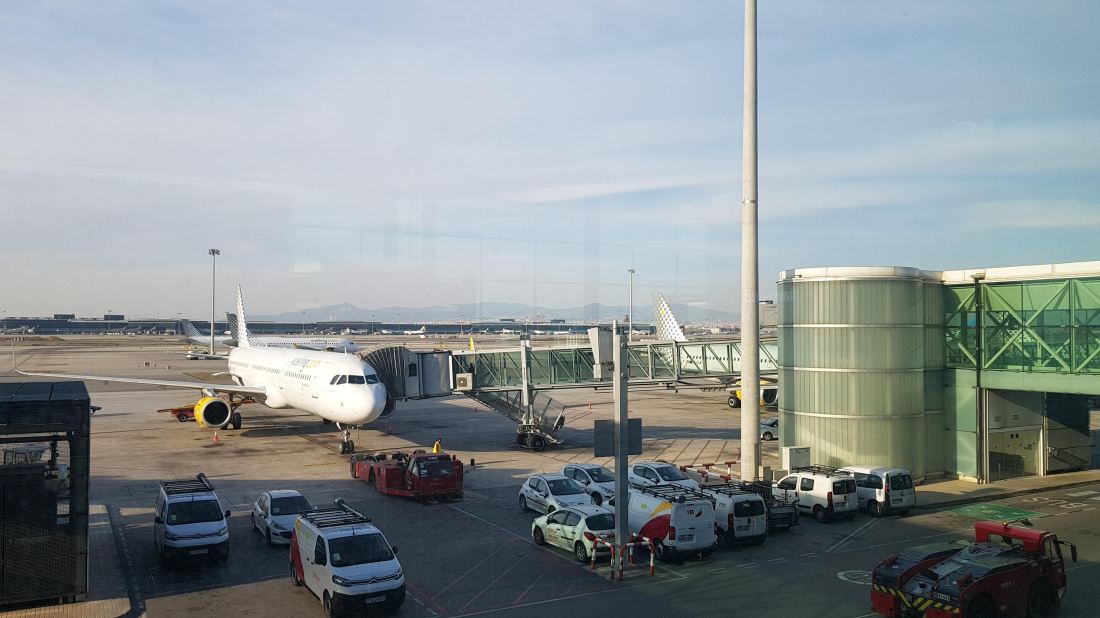 Wenig später landet der Airbus butterweich am Barcelona El-Prat-Airport und parkt auf einer Außenposition. Durch die IAG-Mutter ist Vueling der einzige Billig-Anbieter, der hier am Prestige-trächtigen Terminal 1 andockt. In diesem Fall passiert das leider nur via Shuttle-Bus. Als Passagier macht es aber grundsätzlich keinen Unterschied, beide Terminals sind in Barcelona optimal an die entsprechende Metro-Linie in die Stadt angeschlossen.