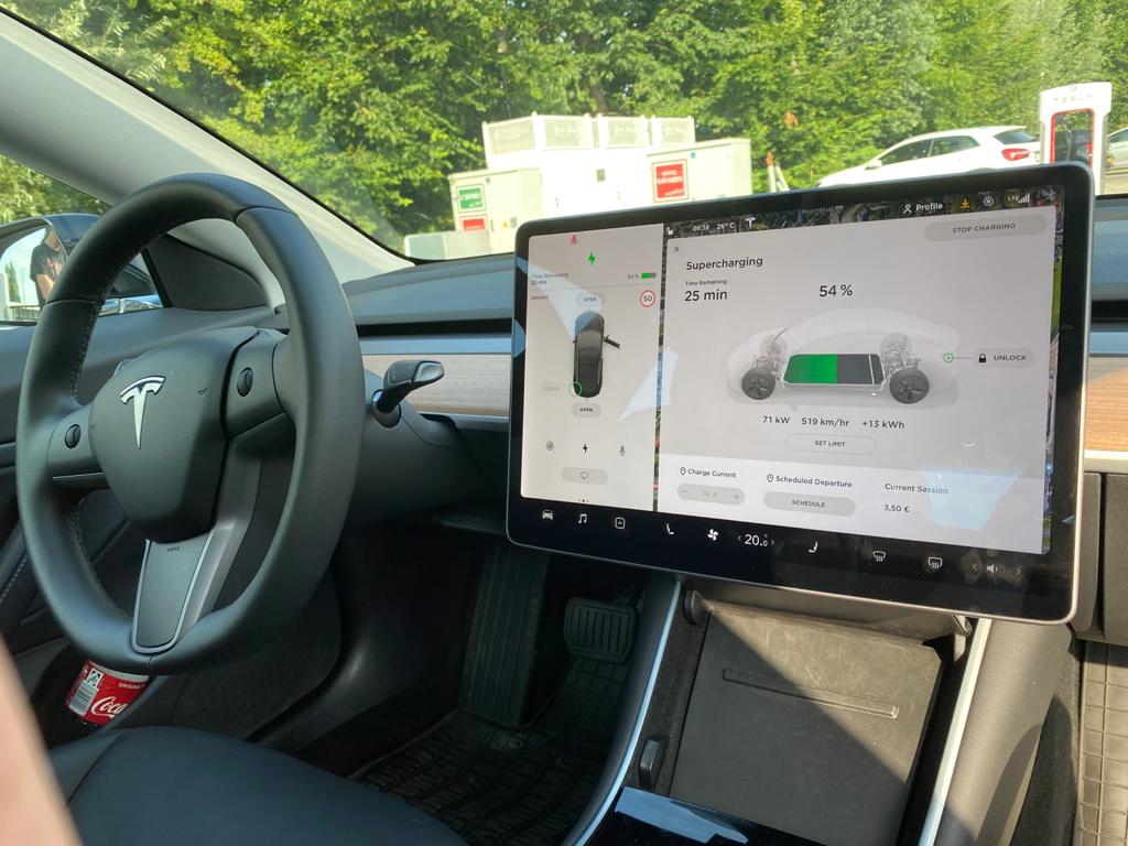 Wie man das halt so gewohnt ist, wird hier die Route berechnet und übersichtlich dargestellt. Zusätzlich rechnet das Model 3 auch sofort alle benötigten Ladestationen auf dem Weg in die Route ein und berücksichtigt dabei Werte wie die Durchschnittsgeschwindigkeit, die Außenbedingungen und auch das Höhenprofil der Route. Wir wissen sofort mit wie viel Rest-Reichweite wir am ersten Ladepunkt ankommen werden, wie lange wir dort laden müssen und wie der zweite Ladestopp ablaufen wird. Dabei rechnet das System lieber mehrere kurze Ladestopps als einen langen, denn Akkus auf 100% aufzuladen dauert bedeutend länger als nur bis 80%, womit man auch schon wieder ein gutes Stück kommt. So verlieren wir laut Navigationssystem pro Ladestopp maximal 15 Minuten. Eine „Toilettenpause“ an der Tankstelle mit kurzem Stopp im Shop ist meist auch nicht signifikant kürzer…