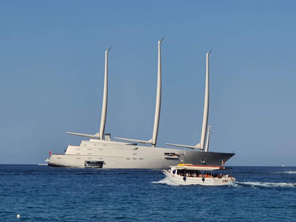 Nettes Gimmick auf der Fahrt zurück: die größte Segelyacht der Welt, die SY A, ankerte direkt vor der Cala Luna und präsentierte sich in der späten Nachmittagssonne als unübersehbares Monument. 400 Millionen Euro soll der Bau gekostet haben. Die Segelyacht ist 142,81 Meter lang, 24,88 Meter breit und verfügt über eine Unterwasser-Lounge, vier Beiboote, sowie ein Mini-U-Boot. Sie gehört dem russischen Milliardär Andrei Melnitschenko.