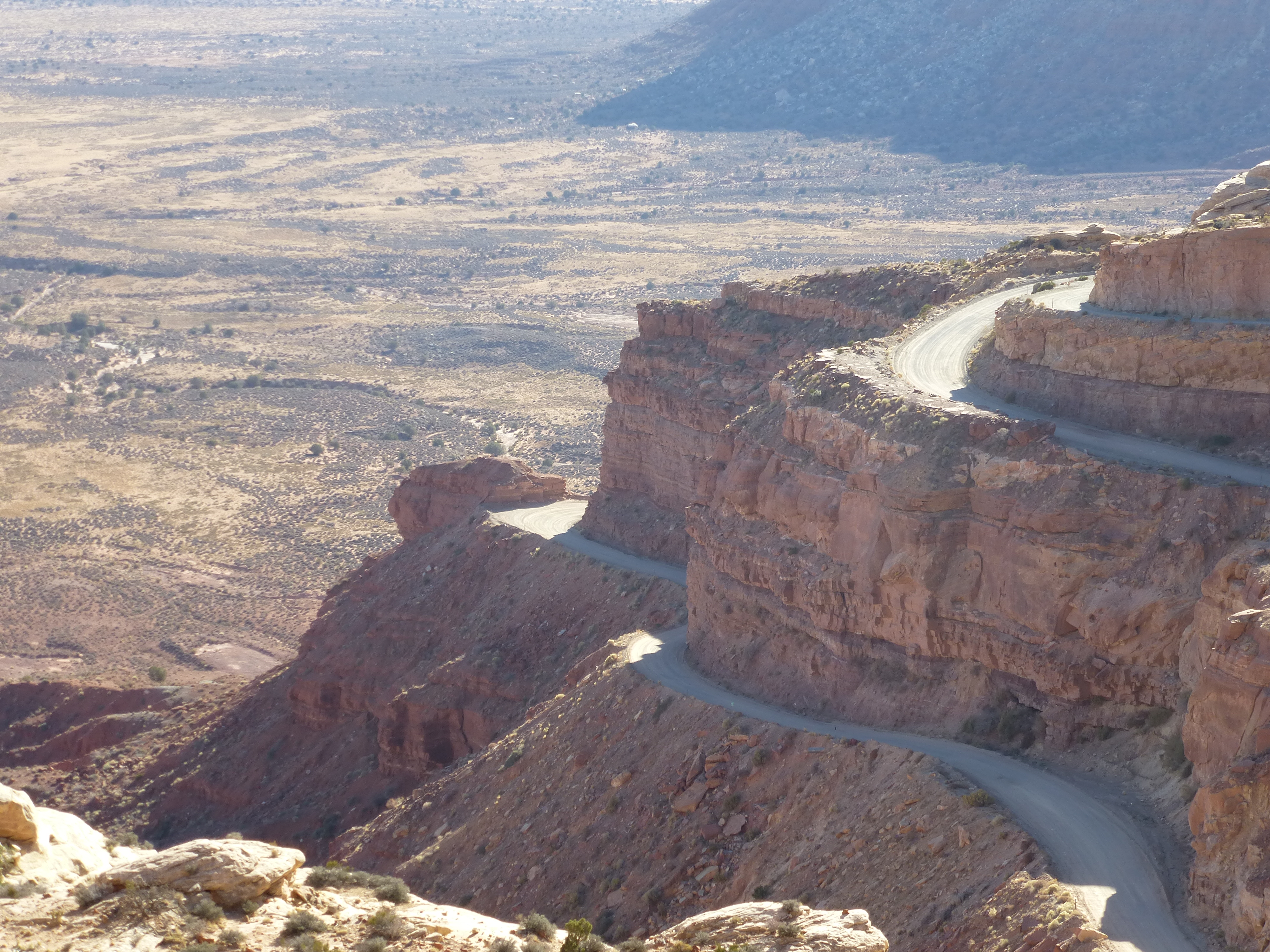 Zur Straße selbst gibt es dabei gar nicht mehr so viel zu sagen. Nehmt euch Zeit, fahrt vorsichtig und genießt die Aussicht an den verschiedenen Stopps auf der Serpentinen-Strecke! Wenn ihr von unten kommt, entfaltet sich nach jeder Kurve ein gigantischeres Panorama, wenn ihr von Norden auf den Moki Dugway stoßt, startet ihr direkt mit der Bombenaussicht auf die gesamte Hochebene des Colorado Pleateau.
