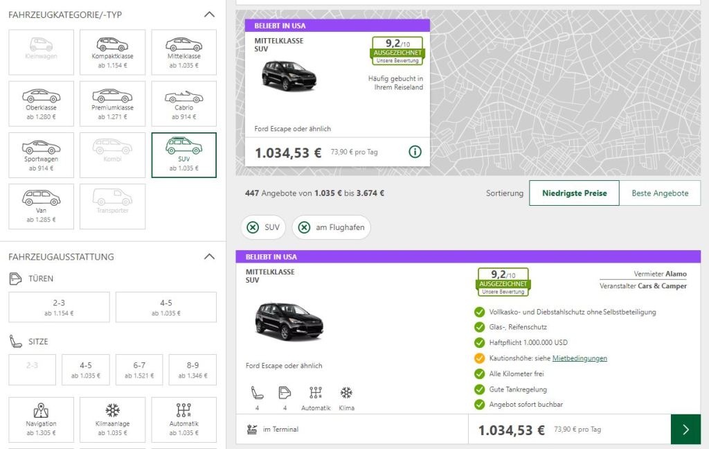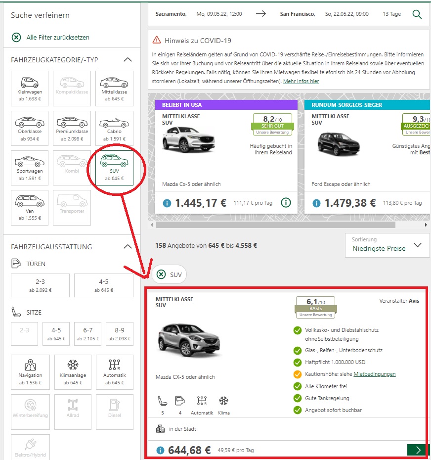 Fairerweise muss man an dieser Stelle aber anmerken, dass man mit ein wenig Flexibilität bei den Daten aber auch bei den großen Flughäfen wieder zumindest günstigere Angebote finden kann. Im Falle von San Francisco haben wir beispielsweise auch einige SUV-Angebote für 890 Euro gefunden. Das ist dann immer noch 140 Euro teurer als die Sacramento-Lösung, aber natürlich mit deutlich weniger Aufwand verbunden.