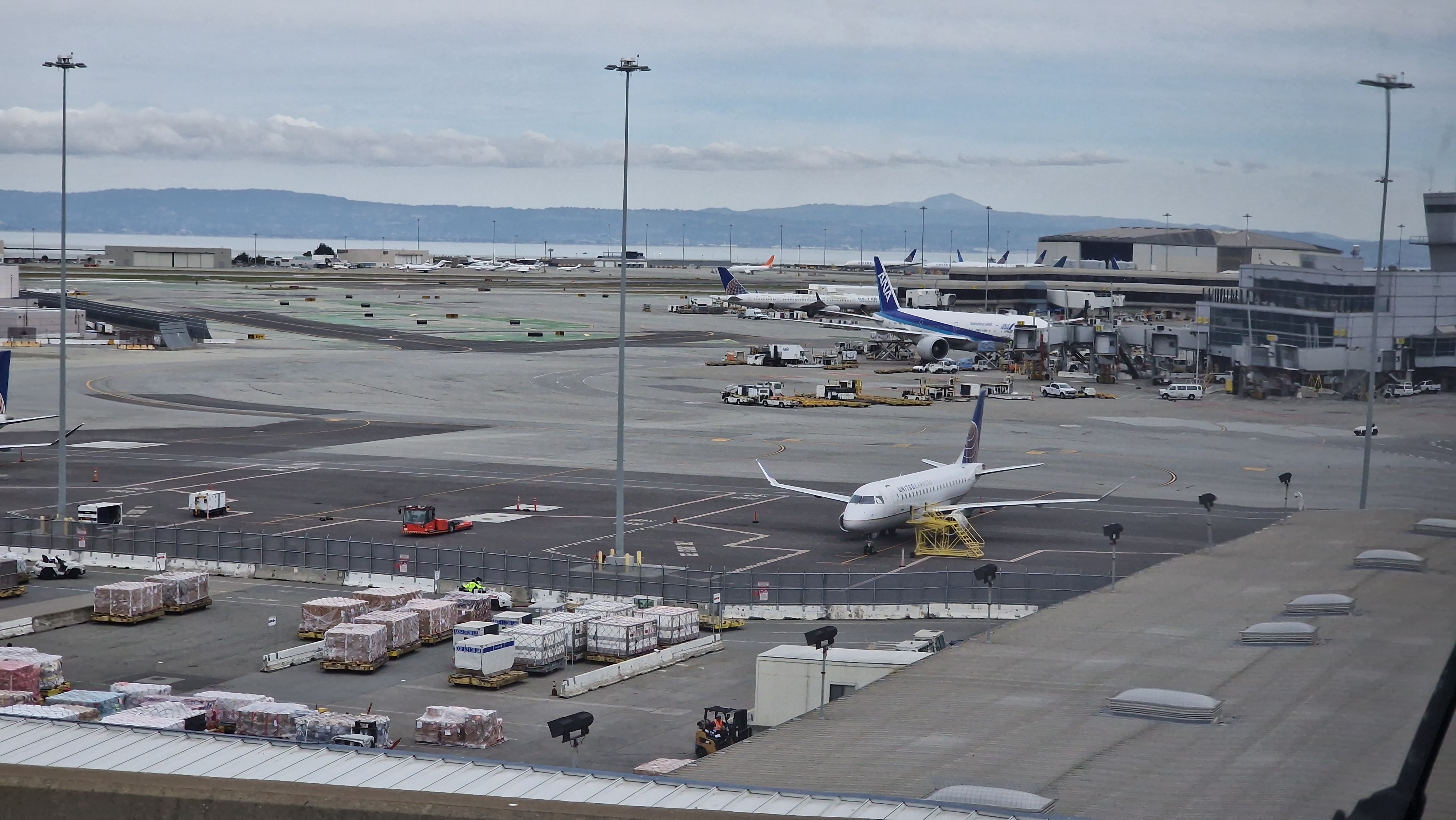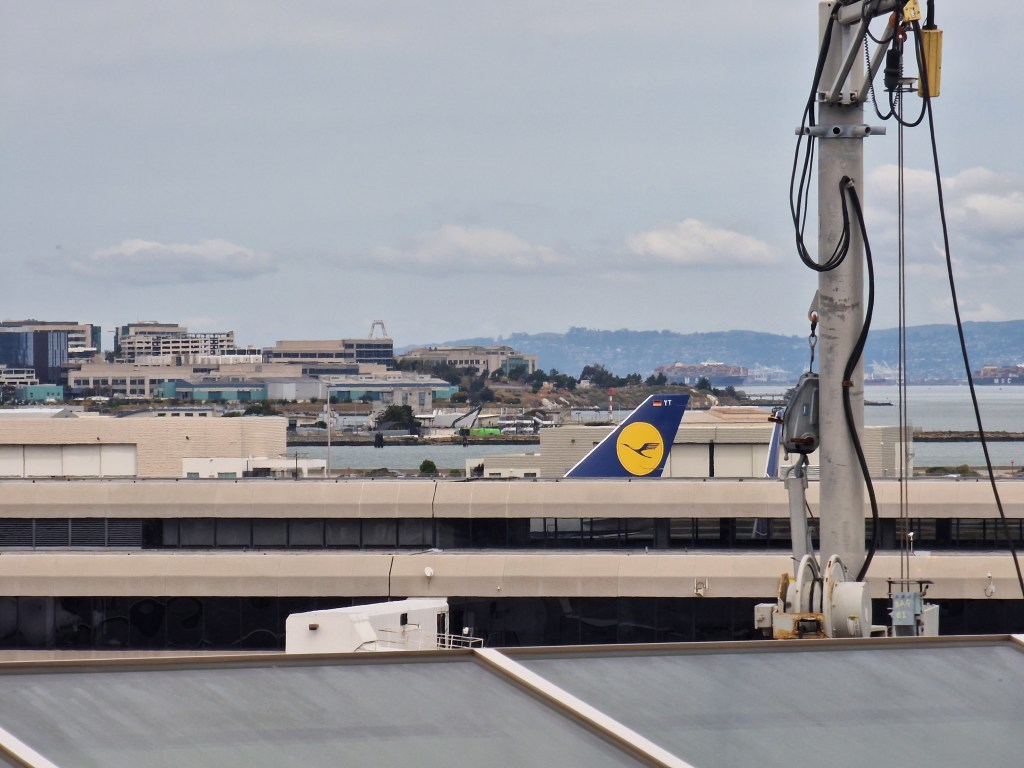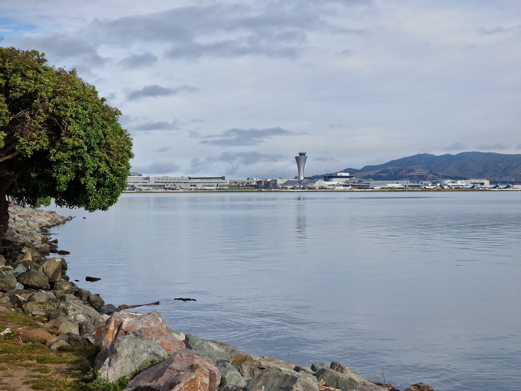 Da wir die letzten zwei Nächte bereits im Flughafen nahen Hampton Inn & Suites San Francisco-Burlingame-Airport-South-Hotel verbracht hatten, waren wir am Tag des Abflugs bereits nah am siebtgrößten Flughafen der USA und konnten den Morgen entspannt angehen. Nach dem Hotelfrühstück verbrachten wir noch ein wenig Zeit an der nahen Bay-Promenade vor dem benachbarten San Francisco Airport Mariott Waterfront-Hotel, von wo aus man ganz entspannt dem Treiben auf dem Flughafen zuschauen konnte.