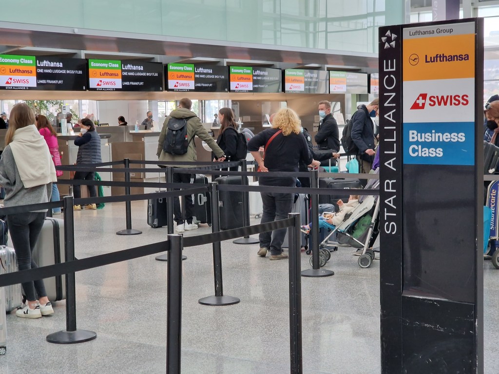 Es war erwartungsgemäß einiges los, auch am Lufthansa-Gepäck-Schalter. Zum Glück durften wir mit unseren Business Class-Tickets an einem deutlich weniger frequentierten Schalter unser Gepäck aufgeben. Das Gepäcklimit reizen wir wie immer nicht aus. In der Business Class darf man theoretisch it 2×8 Kilogramm Handgepäck und 2x 32 Kilogramm Aufgabegepäck (!) fliegen, also zusamengerechnet 80 Kilogramm Gepäck für jeden Passagier. Vollkommen absurd, haben wir noch nie hinbekommen. Wir reisen ganz normal mit Rucksack und einem großen Koffer.