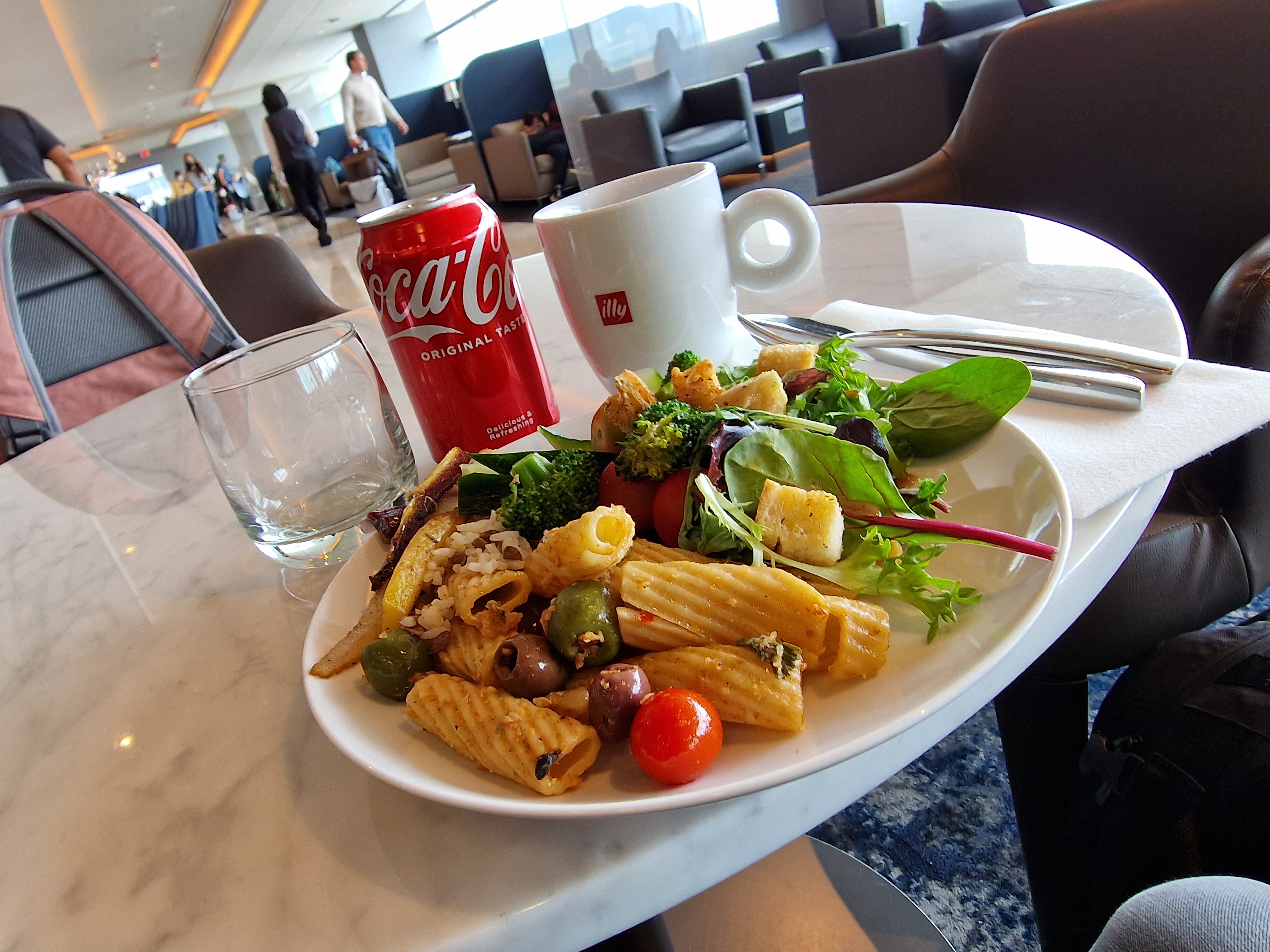 Die Größe war nach der ausladenden United Polaris-Experience auch unser größter Kritikpunkt am American Express-Produkt. Die Lounge war voll mit Menschen, es gab kaum freie Plätze, im Restaurant-Bereich (Buffet) stapelten sich die Gäste regelrecht. Wir fanden nur mit Glück einen Sitzplatz und futterten uns auch hier ein wenig durch. Die gebotene Qualität war gut, die Auswahl ebenfalls, aber nach der United Polaris dann doch ein Downgrade.