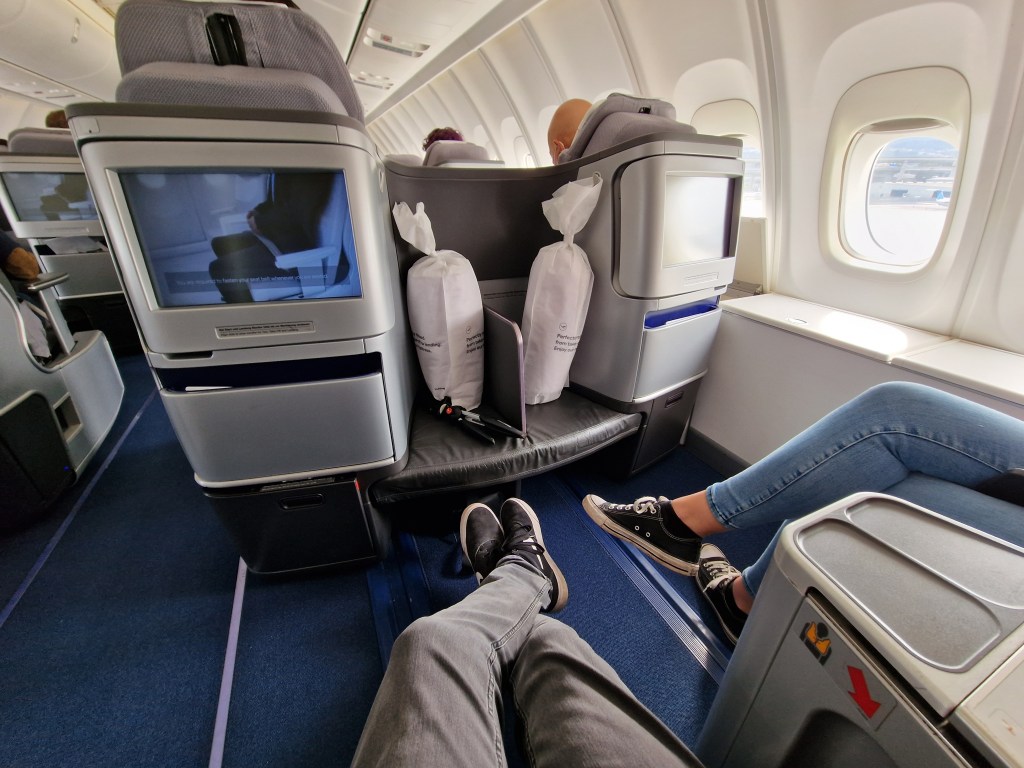 Der Lufthansa-Sitz bleibt für viele der Hauptkritikpunkt. Als reisendes Pärchen kommen wir mit der 2er-Konfiguration nach wie vor gut klar und haben da auch nicht wirklich was zu meckern. Gerade die offene Bauweise der Business Class sorgte dafür, dass wir uns nicht so eingeengt fühlten wie bei der SWISS. Aber das ist definitiv Geschmackssache, wie zahlreiche positive SWISS-Reviews im Netz beweisen!