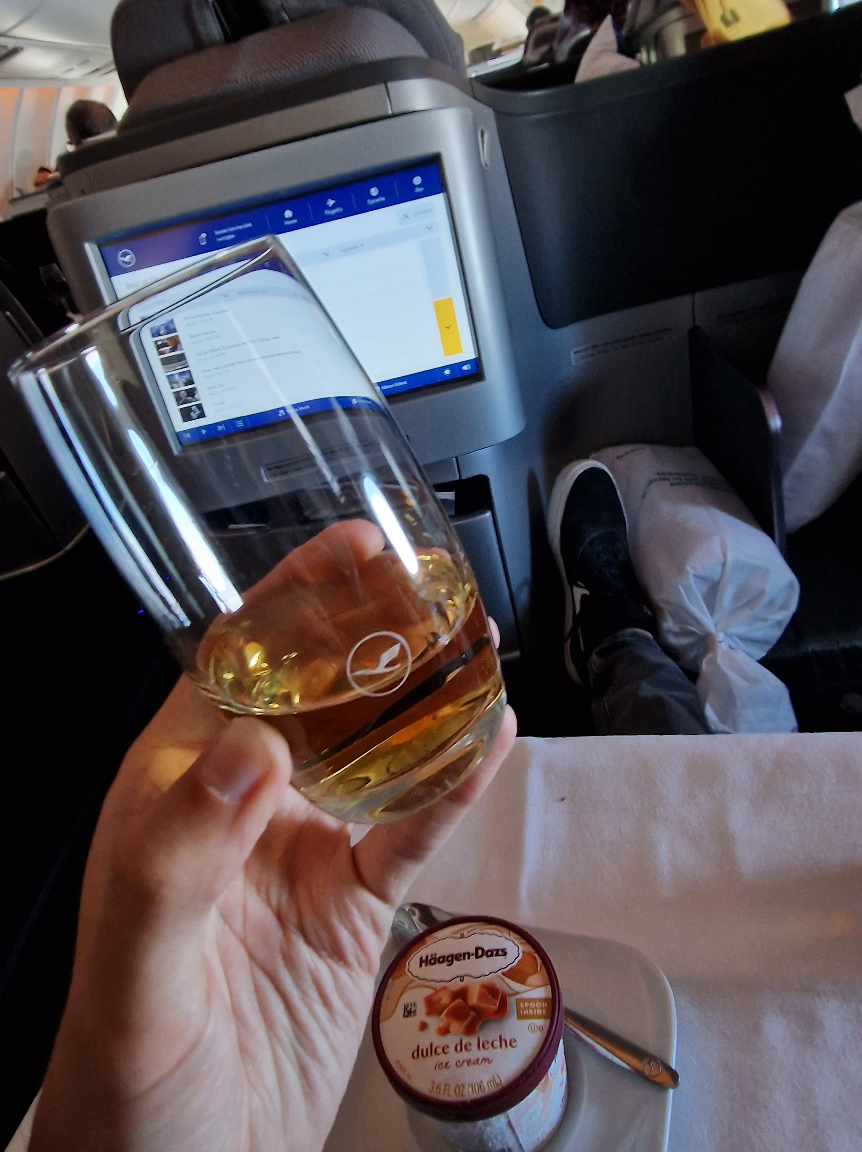 Anschließend war der Flug völlig entspannt. Der Service startete zügig, die Freundlichkeit und Aufmerksamkeit des Flugpersonals war allenfalls durchschnittlich. Wir hatten den Eindruck, dass andere Passagiere deutlich freundlicher und vor allem regelmäßiger bedient wurden. Das waren wir von unserem letzten Lufthansa-Business-Class-Flug im Jahr 2019 ganz anders gewohnt, wo die Freundlichkeit der Crew definitiv das etwas veraltete LH-Bordprodukt rausreißen konnte. Das war bei diesem Flug leider nicht der Fall.