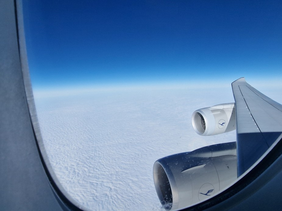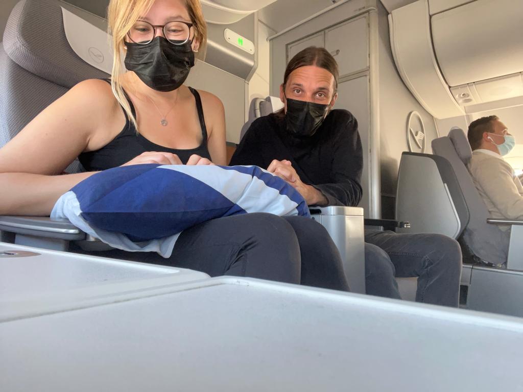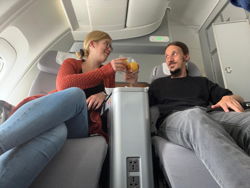 Nach dem durchaus schmackhaften Catering-Massaker nutzten wir die Flugzeit um einen Film zu schauen und anschließend im komplett flachen Sitz zu schlafen… in über 10 Kilometer Höhe bei fast 1000 Stundenkilometern. An diese geniale Art zu reisen werden wir uns wohl nie so ganz gewöhnen.