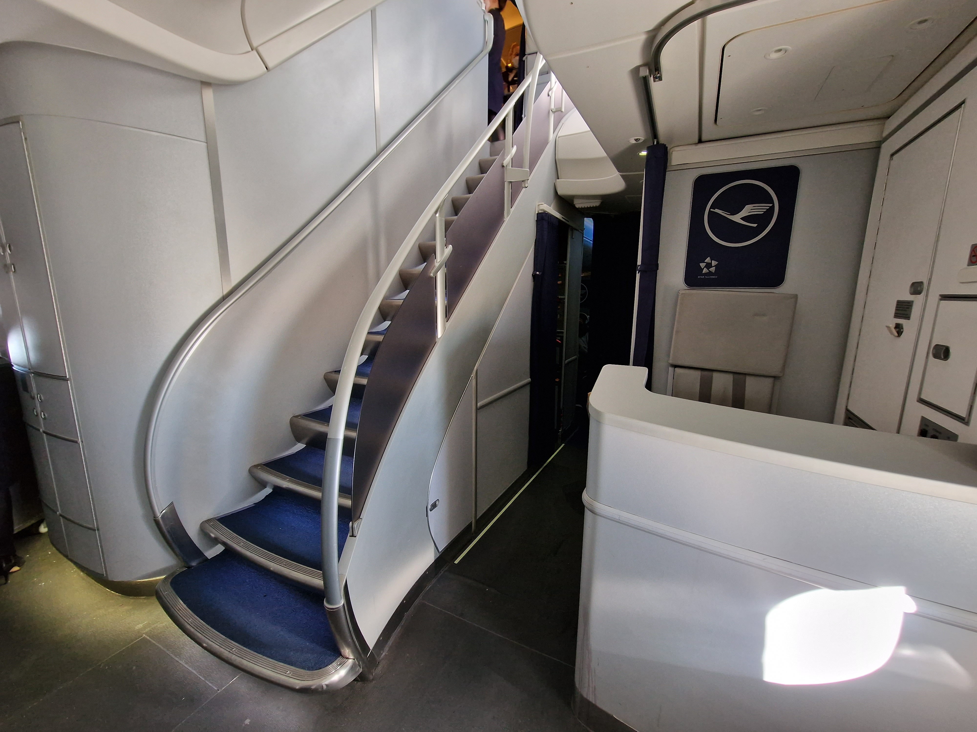 Auch die D-ABYT bekam zwei Glücks-Klopfer auf die Außenhaut, bevor es rein ging. Dann rechts abbiegen (in der Flugzeug-Nase befindet sich bei der 747-8 die First Class), durch riesige Business Class auf dem Hauptdeck und dann die Treppe hoch.