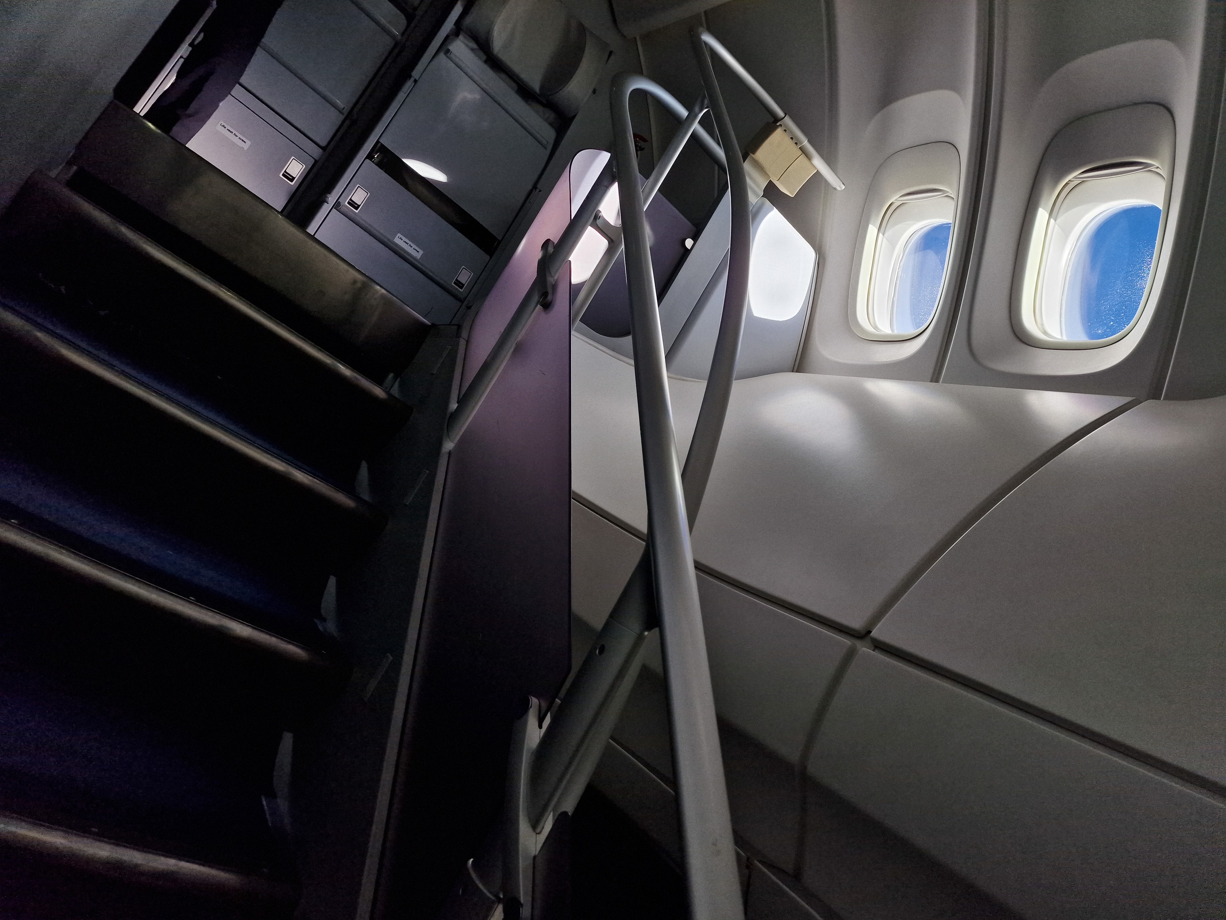 Wir müssen schon sagen, der Anblick einer geräumigen Treppe an Bord eines Flugzeugs ist alleine schon bemerkenswert, aber wie selbstverständlich die Stufen hochgehen zu können, ist die Sahne auf dem Business Class-Kuchen.