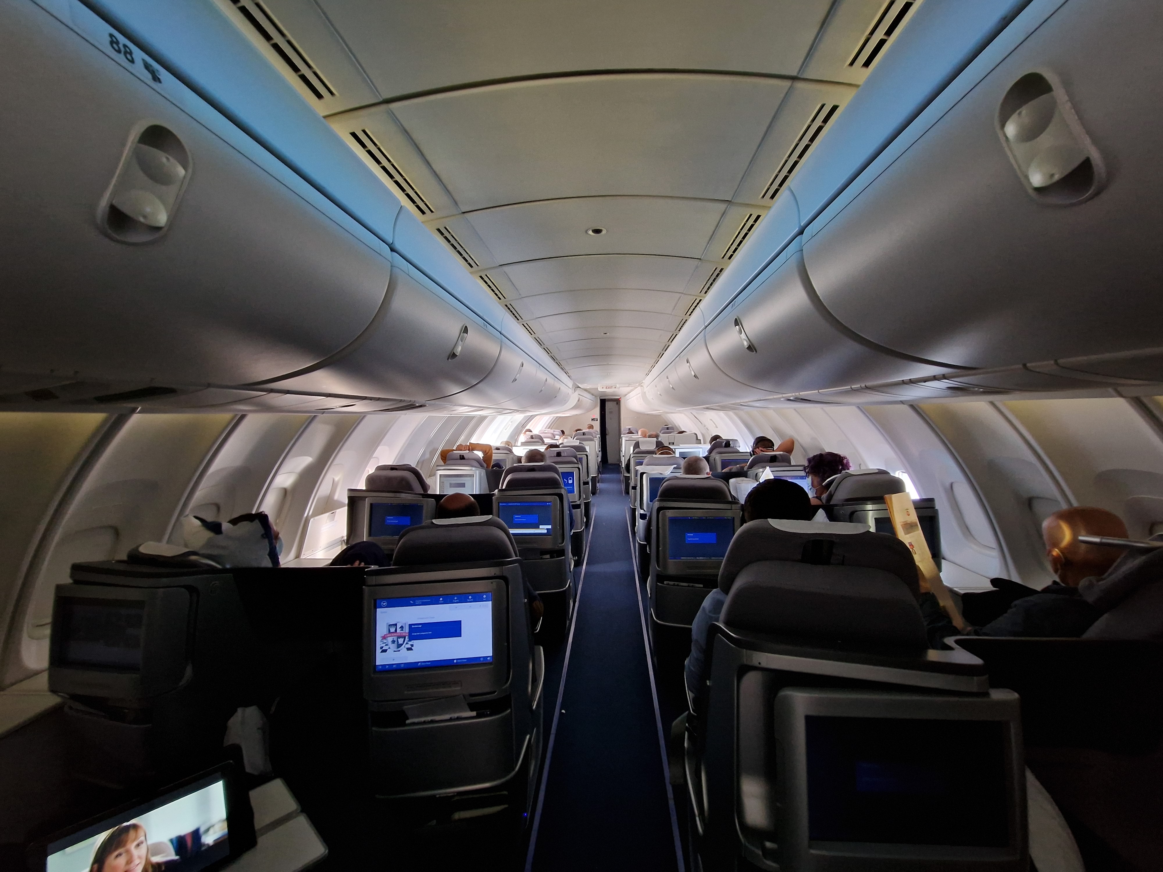 Wie bei der Lufthansa üblich, wurde auch hier die klassischen 2er-Business Class-Sitze verbaut, oben allerdings mangels Platz in einer 2-2er Konfiguration (Hauptdeck: 2-2-2). Somit wirkt das Upper Deck wie eine kleine Maschine, fast schon wie ein Privatjet, wenn da nicht das gigantische Flugzeug einen Stock tiefer wäre… Auch beim „Ankommen“, also dem Verstauen des Handgepäcks, Jacken etc. ist das Upper Deck sehr angenehm, da nicht so viel Durchgangsverkehr herrscht, wie im Hauptdeck.